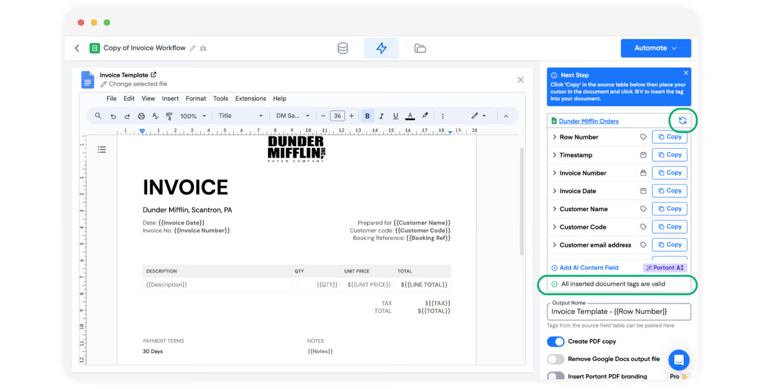 Upon successful resolution, refreshing your source table will display the message: 'All inserted document tags are valid,' as illustrated in the image below: