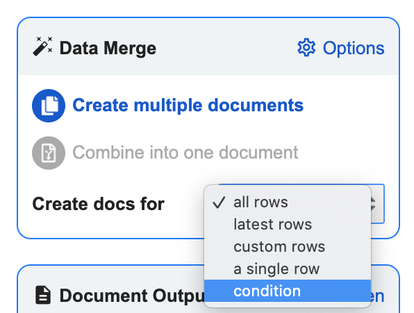 Conditional logic is a great setting if you want to create documents only from certain rows within a spreadsheet. It can be selected from the dropdown list within the Data Merge box.