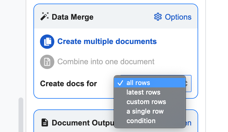 - Combine into one document - This setting combines multiple rows of data into one document (only works with Sheets)