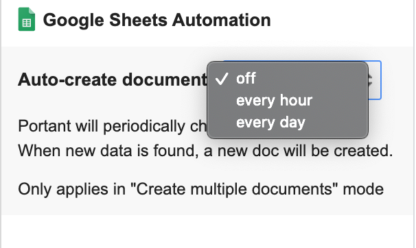 Portant will periodically check the source file every hour or day. When new data is found in the source Google Sheet, a new document is created.