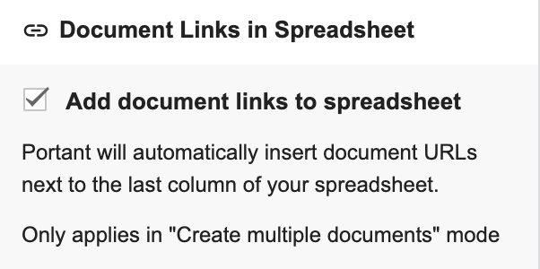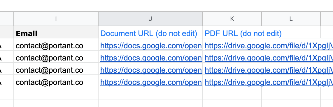 When selected, Portant will automatically insert document (and pdf) URLs next to the last column of your spreadsheet. like this:
