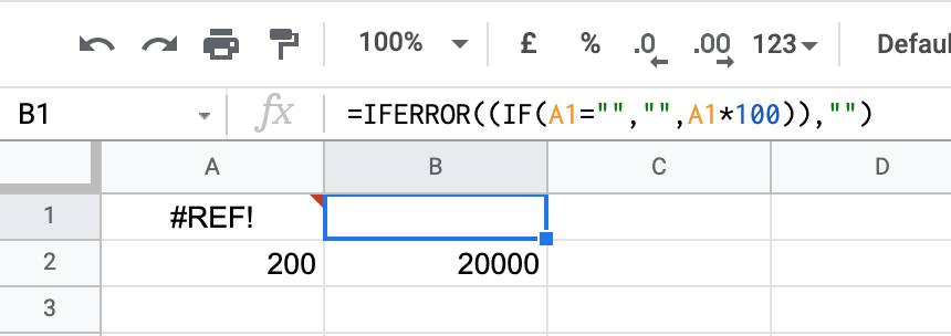 To avoid errors you can use the IFERROR formula: =IFERROR("no error", "error") Returns the first argument if it is not an error value, otherwise returns the second argument if present, or a blank if the second argument is absent e.g. =IFERROR(A2*100, "")