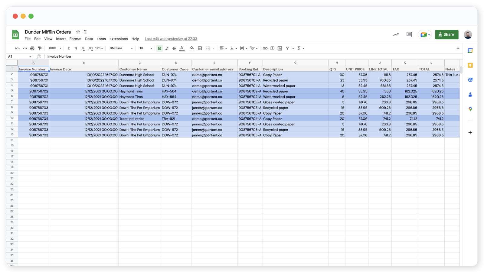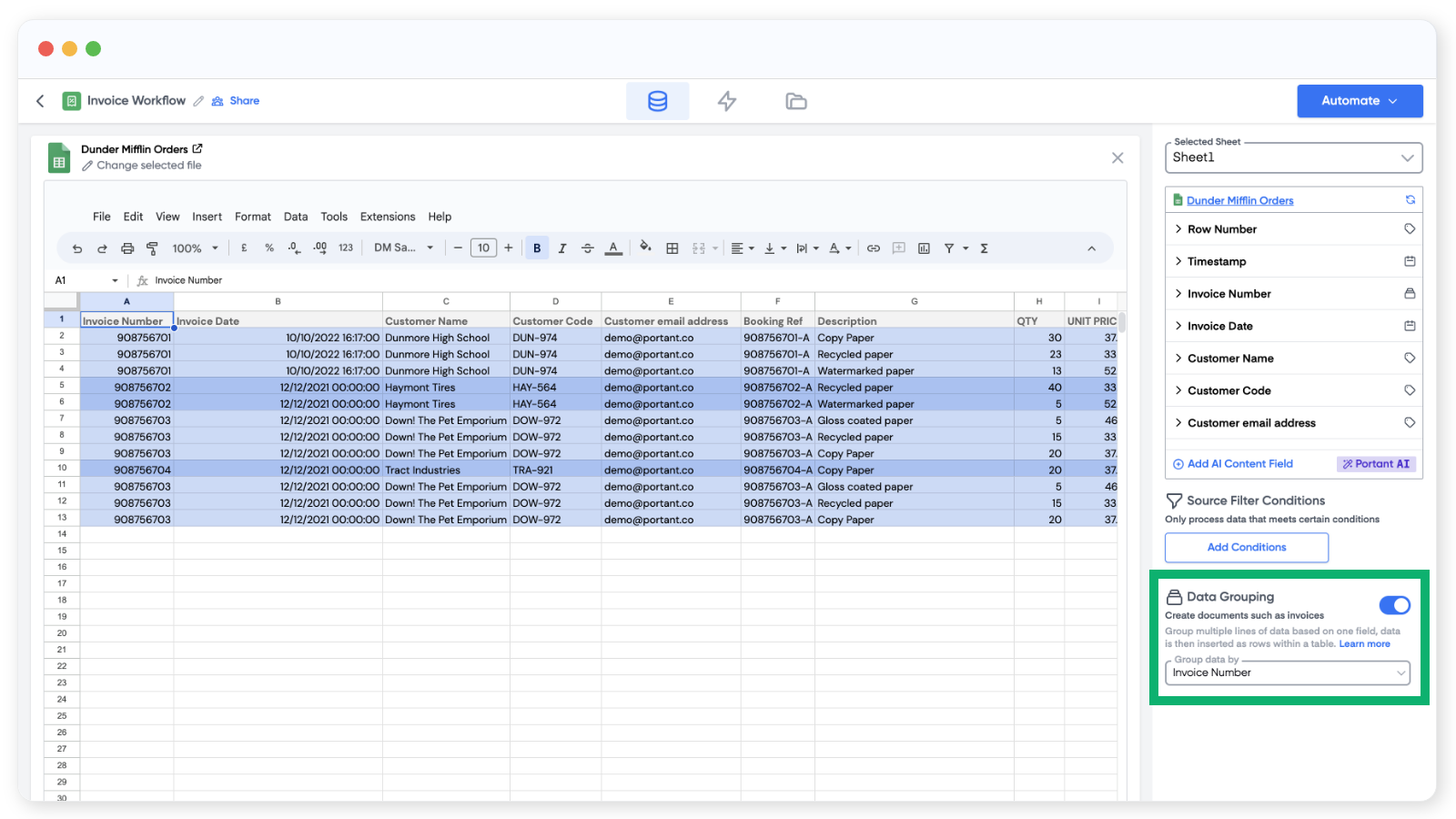 Portant Workflow can group data within your source spreadsheet and place it into tables within your document. If your source spreadsheet contains multiple rows that should be grouped and inserted into one table then this is the feature for you. A good example use case is when you need to include multiple Google Sheet rows into an invoice template or purchase order.