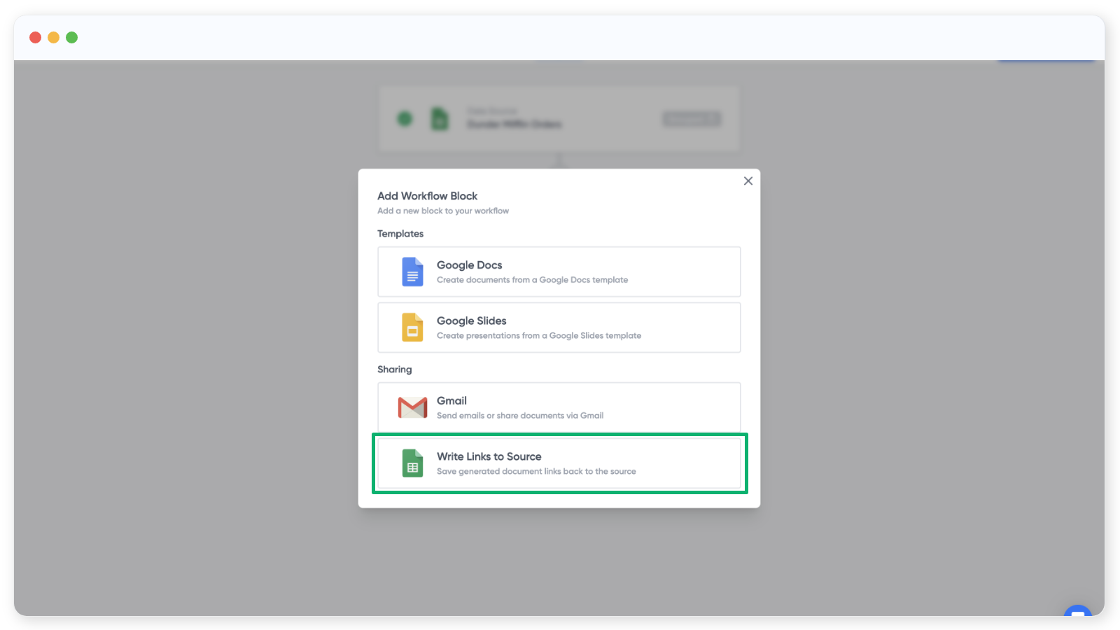 You can only add a "write links to source block' if you have built a workflow that uses Google Sheets as a source. If you have a sheets workflow, when you click the 'Add block' buttons, an option in the sharing section will appear that is called 'Write links to source', like this: