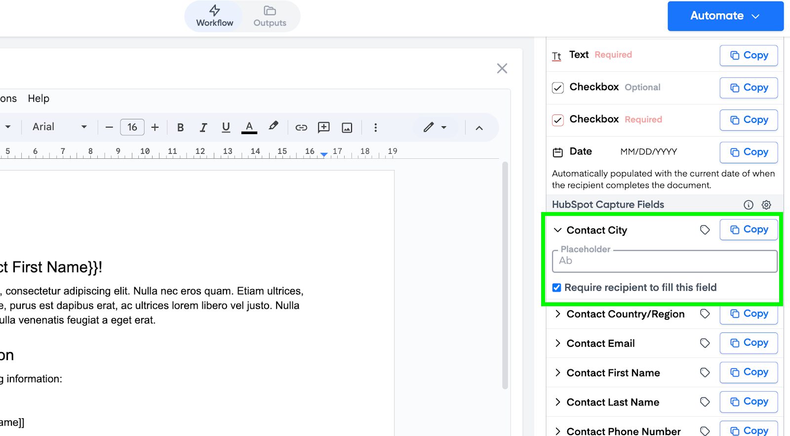 You can also mark each property as required or not required before the document can be signed. There is also the option to add placeholder text in the input field.