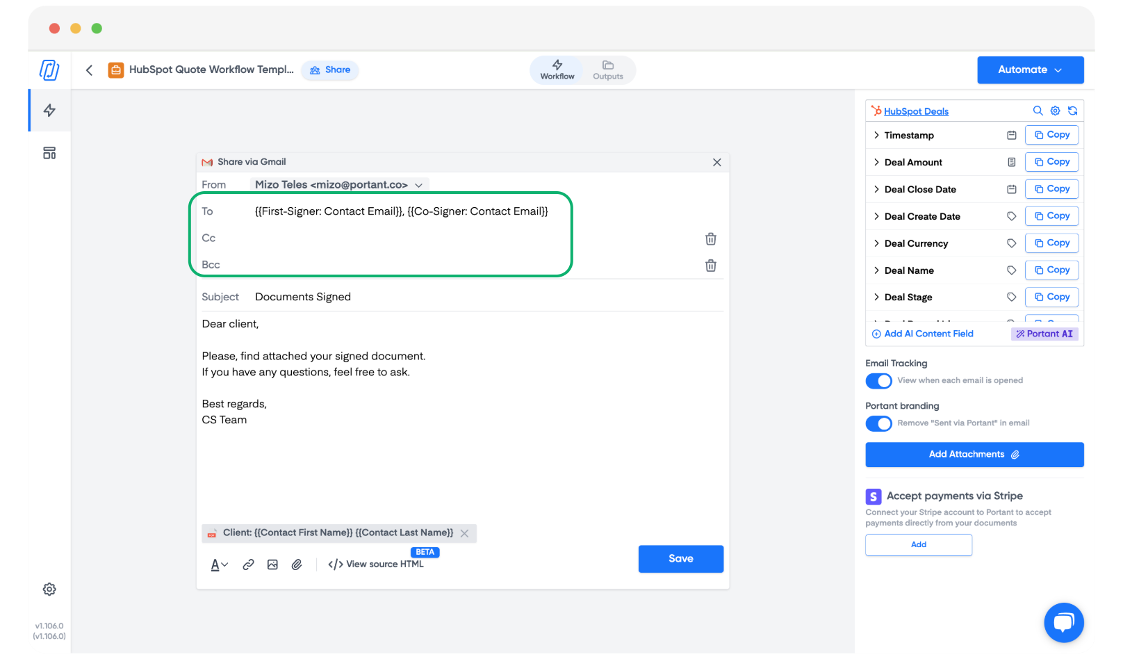 Did you know that you can conveniently handle all HubSpot fields using the Portant App and view a complete list of potential fields for your workflow? Moreover, you can seamlessly incorporate custom properties from your HubSpot account. 😀