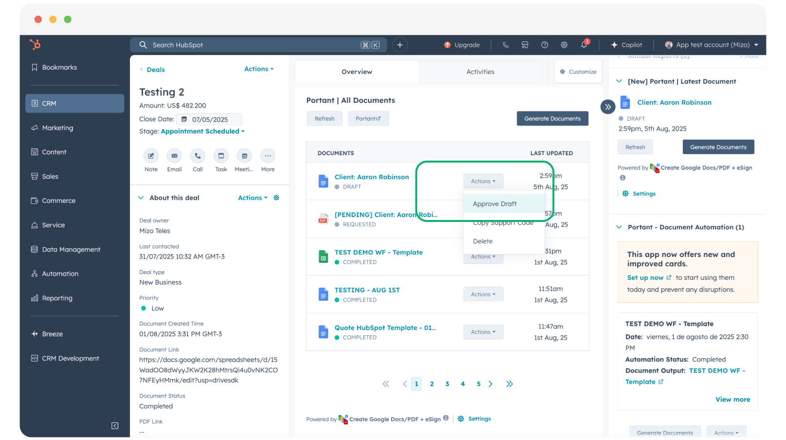 To approve the document at a later time, just click the link in the AppCard again to reopen the modal. Alternatively, you can approve the draft directly from the AppCard located in the middle section of the HubSpot record.