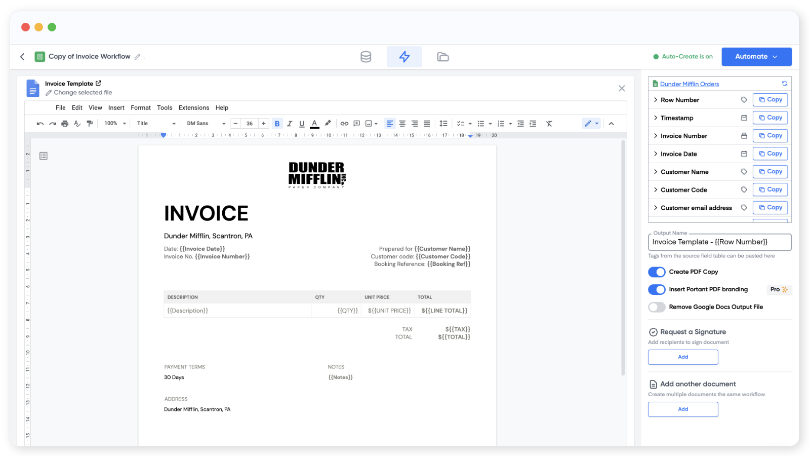 Portant Workflow can group data within your webhook payload and place it into tables within your document. A good example use case is when you need to include multiple objects into an invoice template, quote or purchase order, like this: