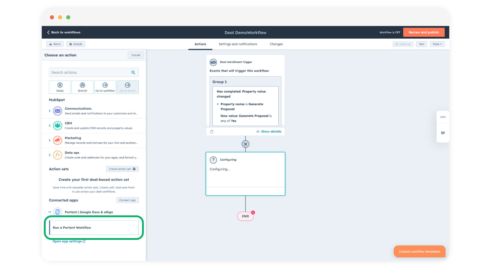 Once your workflow is set up and tested, you can trigger Portant to create the QBR from a HubSpot workflow: